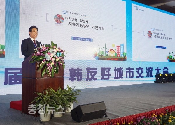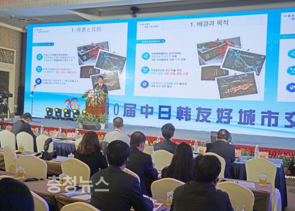 김홍장 당진시장이 지난 18일 중국 허난성 카이펑시 카이위안밍두 호텔에서 개최된 제20회 한‧중‧일 지방정부 교류회에서 ‘환경보호와 지속가능발전’을 주제로 발표했다.
