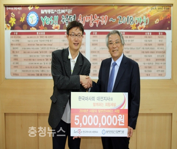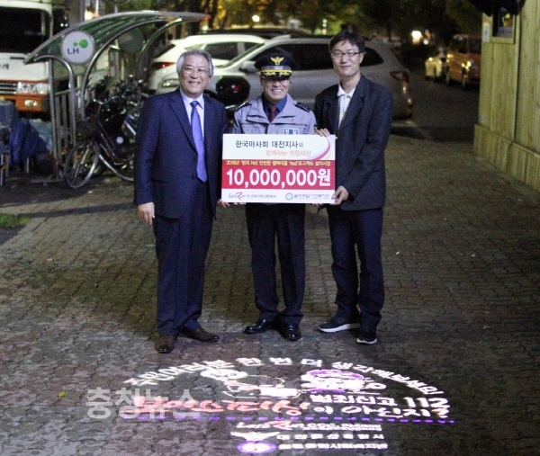 한국마사회 대전센터(센터장 장영완)는 지난 18일 “범죄 No! 안전한 행복마을 Yes!"라는 캐치 프레이즈를 내걸고 실시하는‘로고라이트 설치 사업’기부금 전달식을 가졌다.