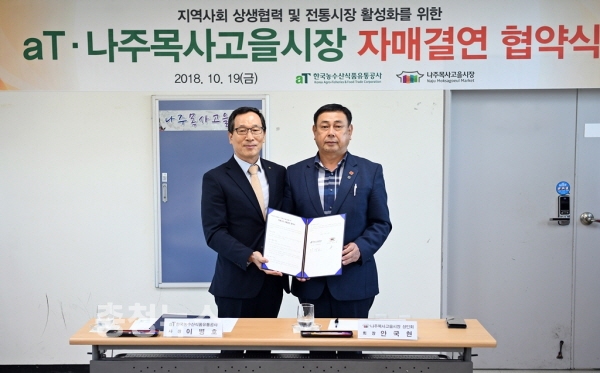 한국농수산식품유통공사(aT, 사장 이병호)와 나주시 목사고을시장상인회(회장 안국현)는 19일 자매결연을 체결했다.
