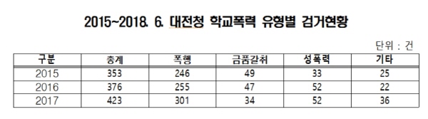 대전청의 학교폭력 검거가 2015년부터 지난해까지 증가했고, 그 중에서 폭행과 성폭력범죄가 증가세를 보이는 것으로 밝혀졌다.