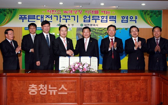 시는 19일 산림청과 '저탄소 녹색성장 시대를 여는 푸른 대전가꾸기 업무협력 협약'을 체결하고 쾌적한 도시환경조성에 앞장설 것을 약속했다.