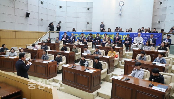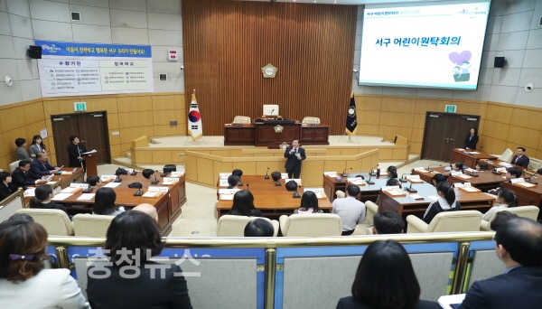 대전 서구(구청장 장종태)는 23일 서구의회 본회의장에서 6개 초등학교 대표 어린이 24명이 참여한 가운데 ‘어린이가 행복한 마을 만들기‘를 위한 정책보고회를 개최했다.