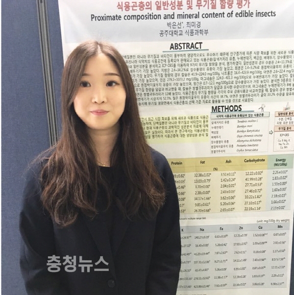 공주대 식품영양학과 석사과정 박은선 학생은 최근 평창 알펜시아 컨벤션센터에서 개최된 2018년 한국영양학회 추계학술대회에서 '식용곤충의 일반성분 및 무기질 함량 평가'라는 논문을 발표해 우수 포스터 논문상을 수상했다고 24일 밝혔다.