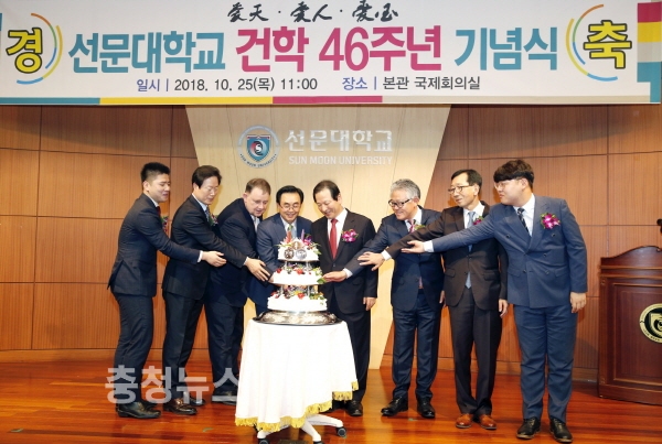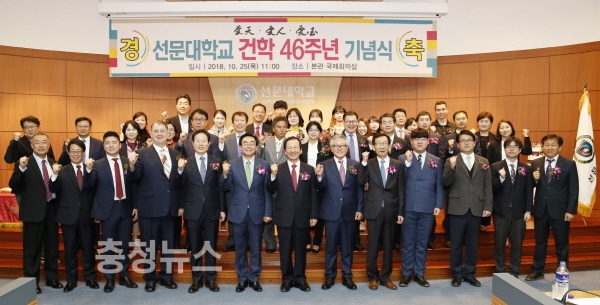 선문대학교(총장 황선조)가 25일 오전 11시 본관 6층 국제회의실에서 선학학원 송용천 이사장, 황선조 총장을 비롯해 교직원, 학부모 및 학생 등 200여 명이 참석한 가운데 건학 46주년 기념식을 개최했다.