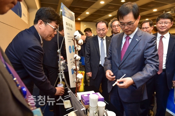 플라스틱 빨대를 대체할 수 있는 친환경 제품으로, 지폐를 만드는 원료인 면펄프가 재료인 ‘종이빨대’를 시연하고 있는 조폐공사 조용만 사장(오른쪽)