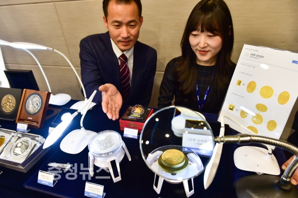 4개 잠상 이미지가 동시에 구현되는 4방향 금속 특수 위변조방지 기술을 소개하고 있는 조폐공사 직원들