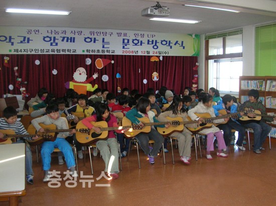 학하초등학교는 한껏 기대하고 설레는 겨울 방학식을 해마다 맞이하지만 오랜 시간 시상식과 교장선생님 훈화를 꼼작 않고 들어야하는 여느 방학식과는 달리 전교생이 참여하는 연주와 노래, 캐롤 메들리, 기타연주 등의 음악 프로그램으로 방학식을 마련했다.