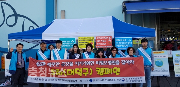 (사)대전소비자공익네트워크(회장 도정자)는 금강유역환경청(청장 김동진)의 후원을 받아 25일 대전 오정농수산물도매시장에서 일반시민 500명 대상으로 ‘깨끗한 금강을 지키기 위한 비점오염원을 잡아라! 5차 대덕구지역 홍보 캠페인’을 열었다.