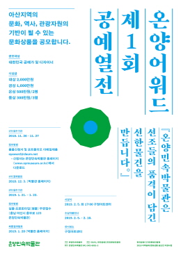충남 아산시(시장 오세현)와 (재)구정문화재단 온양민속박물관(관장 김은경)이 2018년 문화체육관광부 공모사업으로 선정된 아산지역의 문화·역사·관광자원의 기반이 될 수 있는 문화상품 공모전 ‘온양어워드-제1회 공예열전’을 개최한다.
