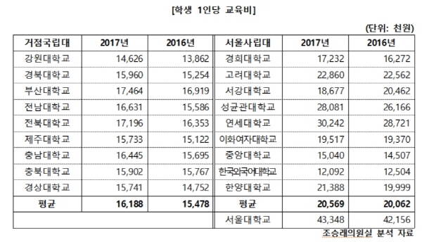 더불어민주당 조승래 의원이 각 9개의 거점국립대학 및 서울 사립대학의 학생1인당 교육비 를 비교 분석한 결과 지난해 서울대를 제외한 전국 지방거점국립대 평균 학생1인당 교육비는 1,619만원으로 조사대상인 서울 9개 사립대 평균 2,057만원의 78.7% 수준인 것으로 나타났다.