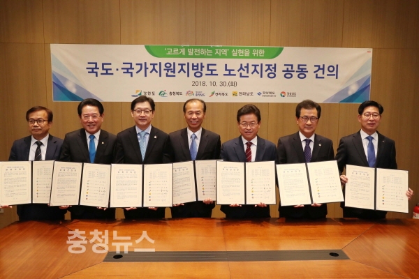 도는 양승조·최문순(강원)·이시종(충북)·송하진(전북)·김영록(전남)·이철우(경북)·김경수(경남) 도지사 명의의 ‘일반국도·국가지원지방도 노선 지정 공동건의문’을 충남도 주관으로 30일 채택, 내달 국회와 정부에 전달한다고 밝혔다.