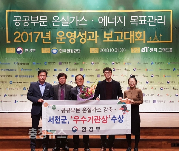 충남 서천군(군수 노박래)은 31일 환경부가 주최하는 ‘공공부문 온실가스 목표관리 운영성과 보고회’에서 온실가스 감축 우수기관으로 선정돼 환경부 장관상을 수상했다.