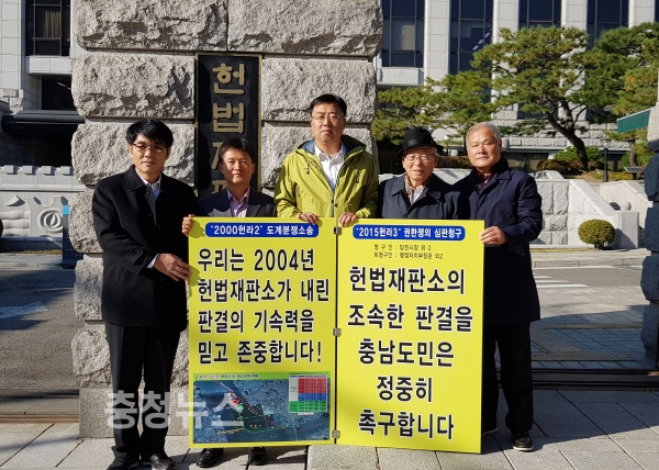 김기재 당진시의회 의장은 1일 서울 헌법재판소 앞에서 관할권 분쟁을 겪고 있는 당진항 서부두 매립지의 당진시 관할 당위성을 호소하기 위해 1인 피켓시위 활동을 펼쳤다.