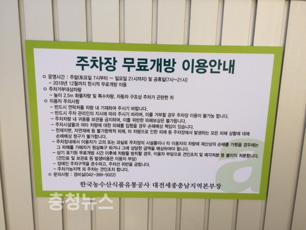 한국농수산식품유통공사 대전세종충남지역본부(aT, 본부장 이윤용)는지역민의 주차난 해소를 위해 지난 31일부터 공휴일, 주말에 사옥 1층 주차장을 무료로 개방한다.