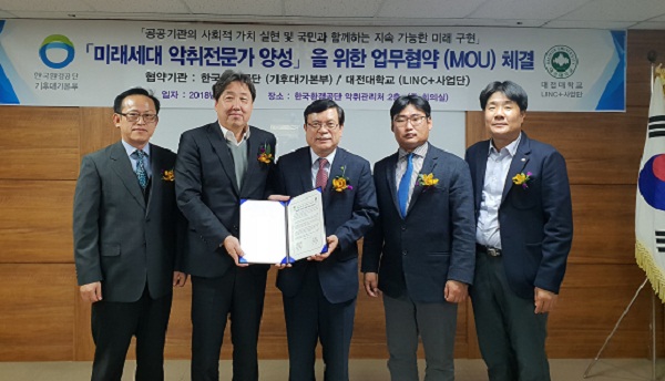 대전대학교 LINC+사업단(단장 김선태 교수)과 한국환경공단(기후대기본부장 신동석)이 지난 1일 한국환경공단 악취관리처 2층에서 ‘미래세대 악취전문가 양성을 위한 업무협약(MOU)을 체결했다. 저작권자 © 충청뉴스 무단전재 및 재배포 금지 충청뉴스 다른기사 보기 기사가 마음에 드셨나요? 충청뉴스 좋은 기사 후원하기 1,000원 3,000원 5,000원 10,000원 30,000원 50,000원 직접입력 비회원 약관동의하기 ※ 소중한 후원금은 더 좋은 기사를 만드는데 쓰겠습니다.