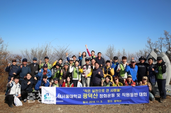 남서울대 개교 이후 매년 이어온 ‘작은 실천, 큰 사랑 운동’의 일환으로 진행된 이번 행사는 가을을 맞아 단풍구경으로 등산객이 많이 찾는 천안 광덕산에서 진행됐다.