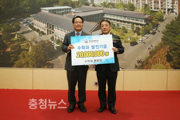 한남대(총장 이덕훈)는 올해로 설립 60주년을 맞은 수학과 교수 및 동문 일동이 총 5500만원의 학과 발전기금을 기탁했다고 4일 밝혔다.