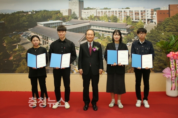 한남대 수학과 유정옥 명예교수가 재학생들에게 장학금을 수여하고 있다.