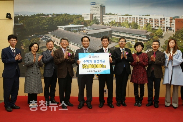 3일 한남대 수학과 60주년 기념식에서 교수들이 이덕훈 총장(왼쪽 다섯 번째)에게 발전기금 3500만원을 기탁하고 있다.
