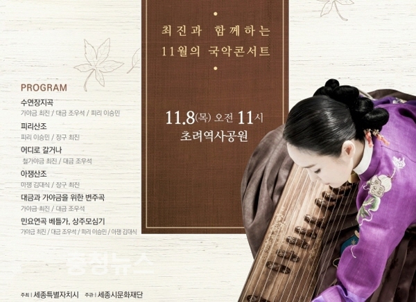이번 공연은 국악강좌를 진행해 온 한국교원대학교 최진교수의 해설과 함께 정악곡 ‘수연장지곡’과 민속악곡 ‘서용석류 피리산조’, ‘박종선류 아쟁산조’, 민요 ‘베틀가, 상주모심기’ 그리고 가야금과 대금의 조화를 이룰 창작곡 ‘어디로 갈거나’와 ‘대금과 가야금을 위한 변주곡’ 등이 1시간 동안 선보인다.
