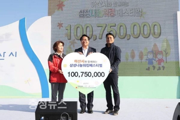 ‘삼성나눔워킹 페스티발’은 시민이 기부하는 만큼 기업이 기부하는 “1+1의 행복나눔” 매칭그랜트 사업으로 이날 행사에는 참가자 10,075명의 기부금과 삼성전자의 매칭펀드로 마련된 총 1억 75만원 전액을 아산시의 복지기금으로 전달했다.
