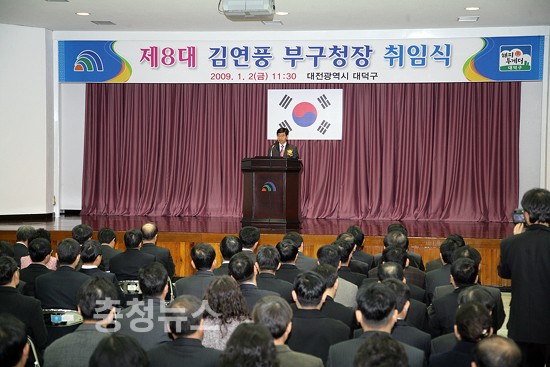 제8대 김연풍 대덕구부구청장(55) 취임식이 2일 오전 구청 대회의실에서 열렸다. ▲ 제8대 대덕구 김연풍 부구청장 취임식 김 부구청장은 취임 인사에서 “직원 상호간 칭찬하고 미소 짓는 신바람 나는 직장분위기를 조성하고, 창의적이고 열정적인 업무 추진으로 지역발전을 이루자”고 당부했다. 김 부구청장은 지난 79년 7급 공채로 공직에 입문해 서산군을 시작으로 대전시 교통정책과장, 환경정책과장, 문화예술과장 등 주요 보직을 두루 역임했다. 저작권자 © 충청뉴스 무단전재 및 재배포 금지 성재은 기자 다른기사 보기 기사가 마음에 드셨나요? 충청뉴스 좋은 기사 후원하기 1,000원 3,000원 5,000원 10,000원 30,000원 50,000원 직접입력 비회원 약관동의하기 ※ 소중한 후원금은 더 좋은 기사를 만드는데 쓰겠습니다.