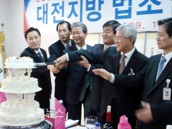▲ 대전 법조계 2009 신년교례회 이태운 대전고등법원장과 박국태 특허법원장 문효남 대전고등검찰청 검사장, 김경종 대전지방법원장, 조근호 대전지방 검찰청 검사장, 임정수 대전지방변호사회 회장
