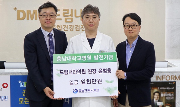사진 왼쪽부터 충남대병원 대외협력센터 구본석 센터장, 드림내과의원 윤범용 원장, 소화기내과 강선형 교수.