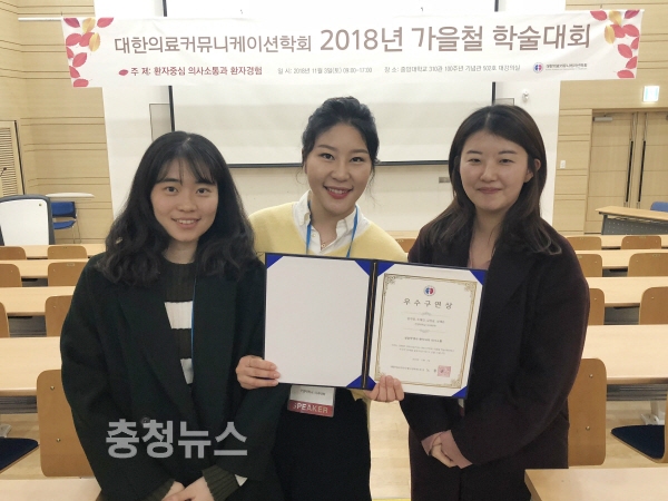 건양대학교(총장 이원묵) 의과대학(학장 박창교) 의료인문학교실 석사과정 김가영, 주예진 씨와 본과 4학년 김정윤, 성재은 씨(지도교수 박용익)가 지난 3일 서울 중앙대학교 100주년 기념관에서 ‘환자 중심 의사소통과 환자 경험’을 주제로 열린 <대한의료커뮤니케이션학회 추계학술대회>에서 “실습학생과 환자와의 의사소통” 주제 발표로 호평을 받아 우수구연상을 수상했다.