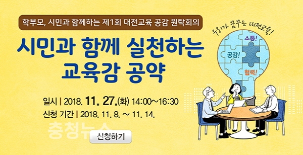 대전시교육청(교육감 설동호)은 오는 27일 호텔 ICC 컨벤션홀에서 시민들과 공감하고 소통하는 대전교육공동체를 만들기 위한 ‘제1회 대전교육공감원탁회의’를 실시한다고 7일 밝혔다.