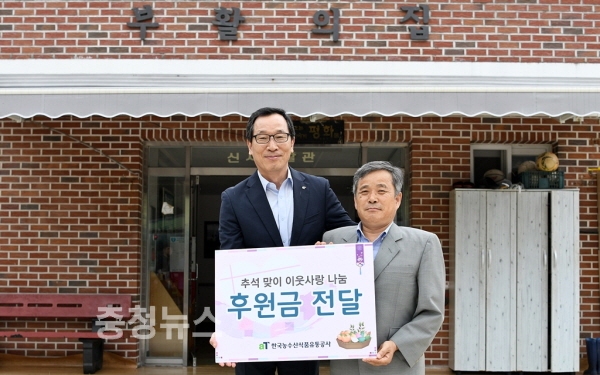 지난 추석(9월) 본사 소재지의 복지시설을 방문해 후원금을 전달하는 aT 이병호 사장(사진 왼쪽)