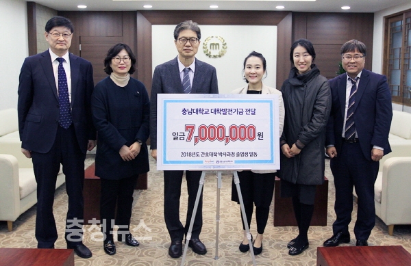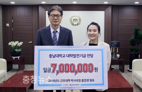 충남대에서 간호학 박사 학위를 취득한 졸업생들이 모교를 위해 발전기금을 기부했다.