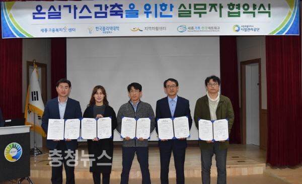 세종시 시설관리공단(이사장 신인섭)은 9일 세종고용복지+센터 대회의실에서 입주기관들과 온실가스 감축 성과공유 체계를 구축을 위해 MOU를 체결했다고 밝혔다.