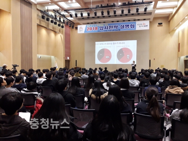 충남 공주시(시장 김정섭)가 지난 10일 고마 컨벤션홀에서 고등학교 1,2학년 학생, 학부모, 입시관계자 등 200여명이 참석한 가운데 2018 입시전략 설명회를 개최했다.