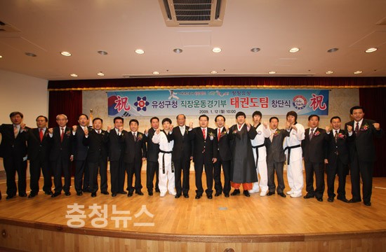 유성구는 올 대전에서 개최되는 전국체전 및 각종 대회를 대비하고 생활체육의 인프라 확충을 위해 12일 오전 10시 민방위교육장에서 진동규 유성구청장, 설장수 구의회 의장, 오노균 대전시태권도협회장, 김영관 대전시 정무부시장을 비롯한 체육관계자와 지역주민 등 200여명이 참여한 가운데 창단식을 가졌다.