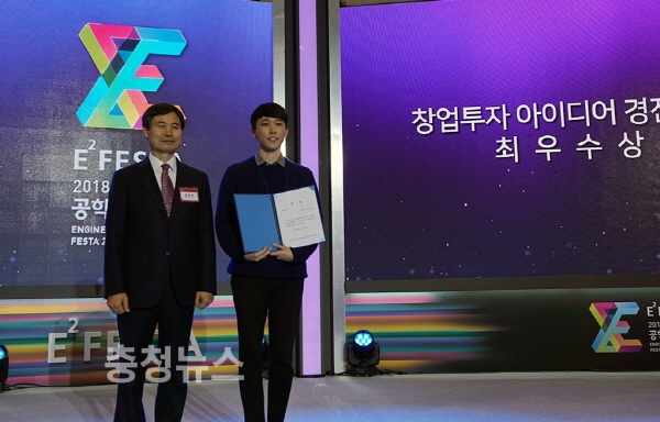지난 8일~9일, 산업통상자원부가 주최한 ‘2018 공학페스티벌’ 행사의 일환으로 열린 ‘창업투자 아이디어 경진대회’에서 기계공학과 정연도 학생(13학번)은 ‘화재 시 간이탈출 장치’로 최우수상(한국산업기술진흥원장상)을 수상했다.