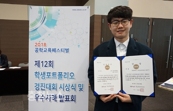 이어, 지난 8일 (사)한국공학교육인증원이 주관해 개최된 ‘제12회 학생포트폴리오 경진대회’에서 기계설계공학과 김중원 학생(14학번)이 제1분야(기계분야)에서 은상(한국공학교육인증원장상)을 받았다.