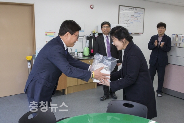 최교진 세종특별자치시교육감이 12일 오후, 세종시교육청에 근무하는 직원 중 15일 예정된 2019학년도 수학능력시험을 치르는 자녀를 둔 직원들을 격려하고 있다.