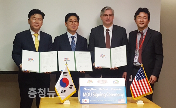 외자유치를 위해 지난 11일부터 미국을 방문 중인 구만섭 천안시 부시장(맨 왼쪽)이 12일(이하 현지시각) 오후 3시 양승조 충남도지사(왼쪽에서 두 번째)와 로버트 캐버나 다우듀폰 이사(오른쪽에서 두 번째), 양승관 다우듀폰 전무(맨 오른쪽)가 참석한 가운데 ‘다우듀폰 특수제품 부문’과 MOU를 체결했다.