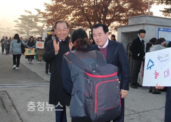 황선봉 예산군수와 김지철 교육감이 15일 예산여고 앞에서 수험생을 응원하고 있다.