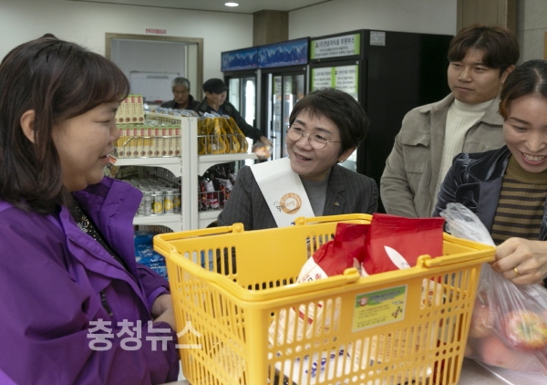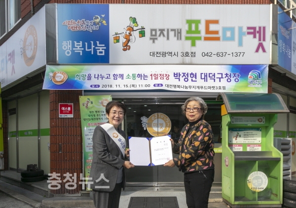 이날 박정현 대덕구청장은 일일 명예점장으로서 직접 상품을 진열하고 방문객에게 필요한 물품을 제공하며, 푸드 마켓 이용 시 불편사항과 건의사항을 청취하는 등 어려운 이웃과 직접 소통하며 행복 전령사 역할을 했다.