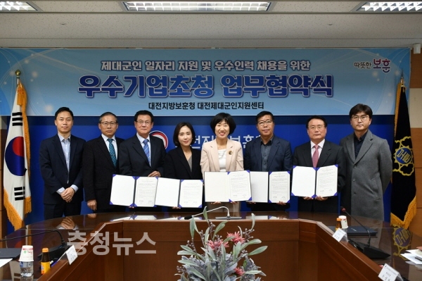대전지방보훈청(청장 강윤진) 제대군인지원센터는 15일 지역내 제대군인 채용 우수기업과 상호 긴밀하고 우호적인 협력관계을 위해 성장가능성이 높은 유망기업 (주)대하(대표 김윤호), (주)티에스관리산업(대표 김선묵), (주)우길(전무이사 백영민), (주)성경식품(본부장 김동진), 청원산업(전무 하재학), 상원산업(주)(전무 하재학), (주)캠베이스(관리본부장 석용수)등 7개사와 업무협약식을 개최했다.