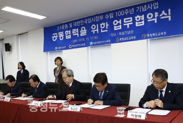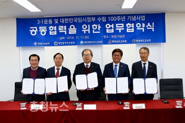 대전·세종·충남·충북 시‧도교육청은 17일 독립기념관(관장 이준식)과 함께 ‘3·1운동, 임시정부 수립 100주년’ 공동 사업을 진행하기 위한 업무협약을 체결했다.