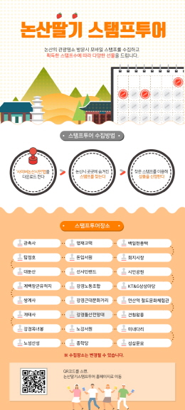충남 논산시(시장 황명선)는 관광객 유치 및 지역경제 활성화를 위해 모바일을 활용한 논산딸기스탬프투어를 상시적으로 추진한다고 밝혔다.