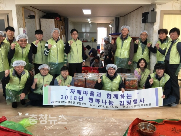 한국철도시설공단 강원본부(본부장 조순형)는 19일 자매 결연을 맺은 강원도 원주시 소초면 수암리 마을을 찾아 ‘2018 행복 나눔 김장행사’를 개최했다고 밝혔다.