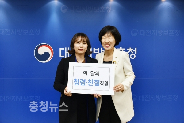 대전지방보훈청(청장 강윤진)은 19일 본청 대회의실에서 10월 '청렴․친절 직원'과 '전화응대 우수 직원'으로 박영주(28, 보상과 고엽제 신체검사 담당) 주무관을 선정해 포상했다.