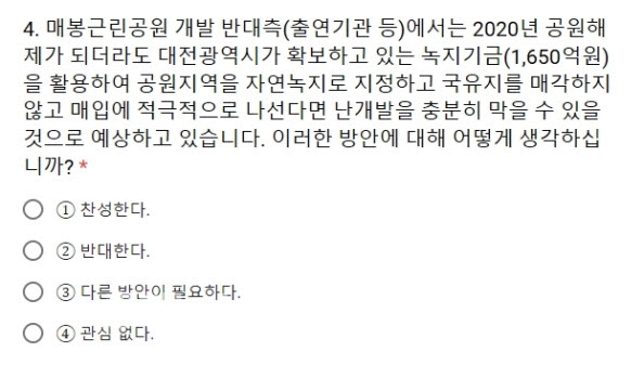‘많은 대덕특구 연구기관과 환경단체들은 매봉산을 개발하는 것에 대해 반대의사를 표시하고 있다’고 못 박은 뒤 의견을 묻는 등 질문 자체의 정당성 역시 의심받고 있다.