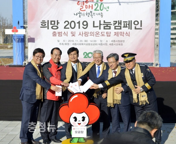 20일 세종시청 광장에서 열린‘희망2019나눔캠페인’출범식과‘사랑의 온도탑’제막식에는 세종시의회 안찬영 부의장을 비롯해 이춘희 시장, 최교진 교육감 등 각 단체장, 시민들을 포함해 총 150여명이 참석했다.