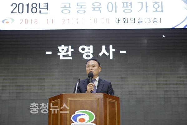 공동육아 평가회에서 인사말을 하고 있는 구본영 천안시장