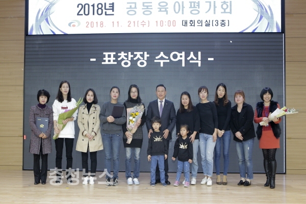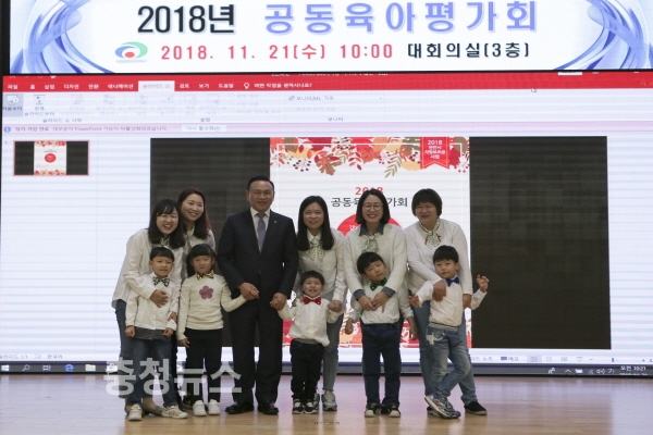 공동육아 평가회 참가자와 함께 사진촬영중인 구본영 시장
